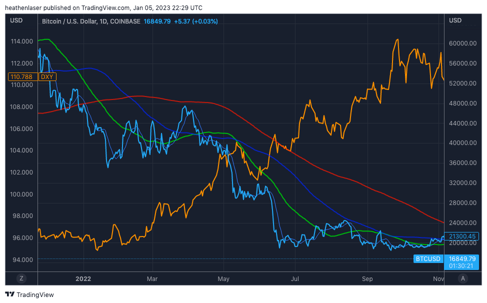 If we overlay the dollar (DXY, orange line below) on that same chart, we see as Bitcoin momentum faded, the dollar’s bull run was just beginning.