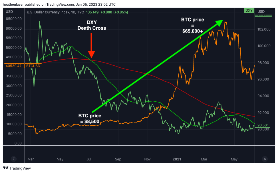 Below, we see the two most recent examples of DXY death crosses, and their effects on BTC and Ethereum (ETH).