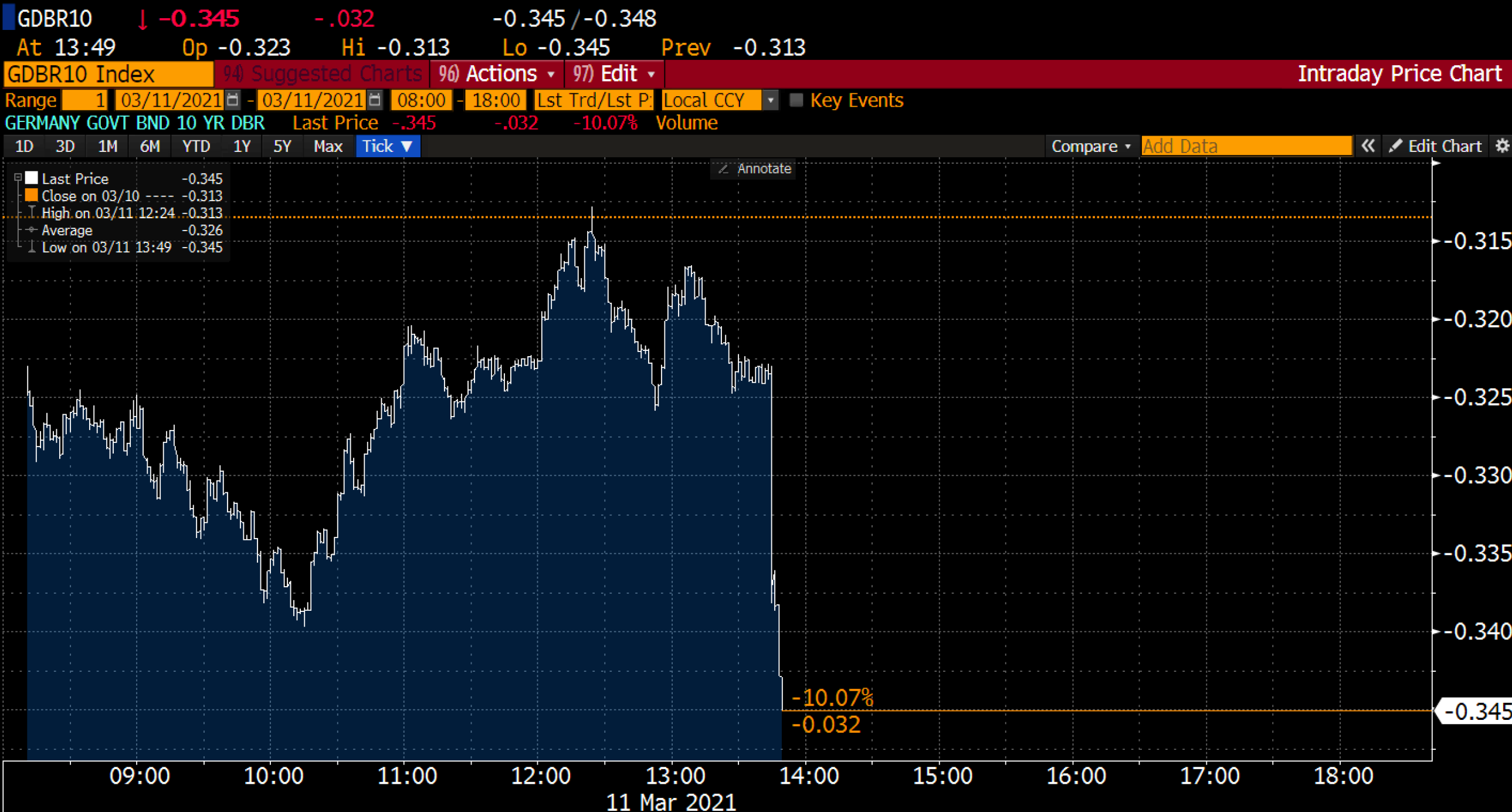 Here’s the German 10yr Bund yield responding to the European Central Bank’s buying.