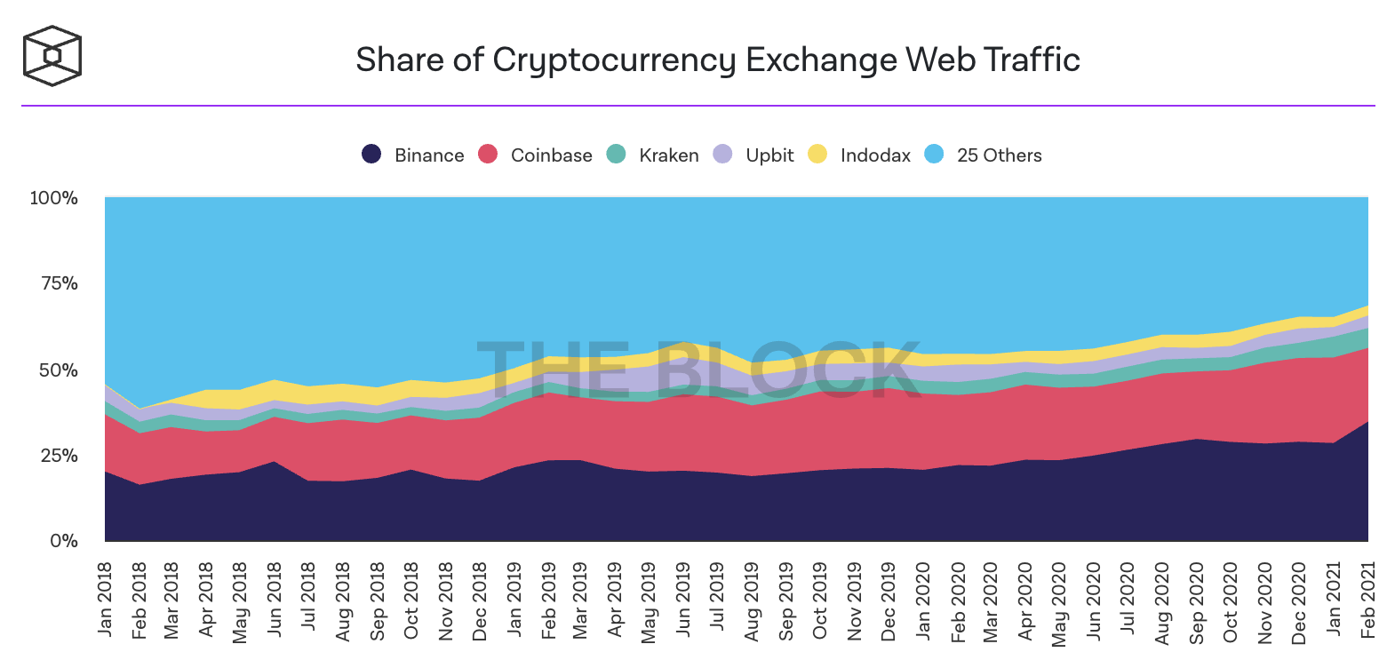 This means if we’re trying to gain a reading on where investors are going, we can look at web traffic. The Block publishes a chart on Cryptocurrency Exchange web traffic relative to others. As you can see below, Binance gained 6% of the market over the last month.