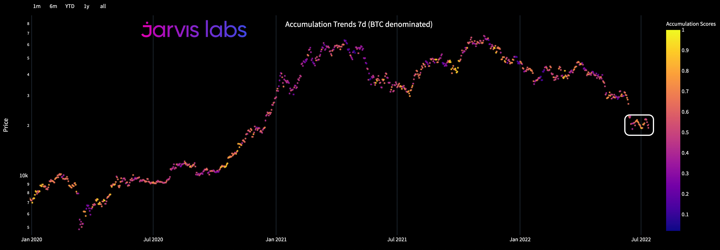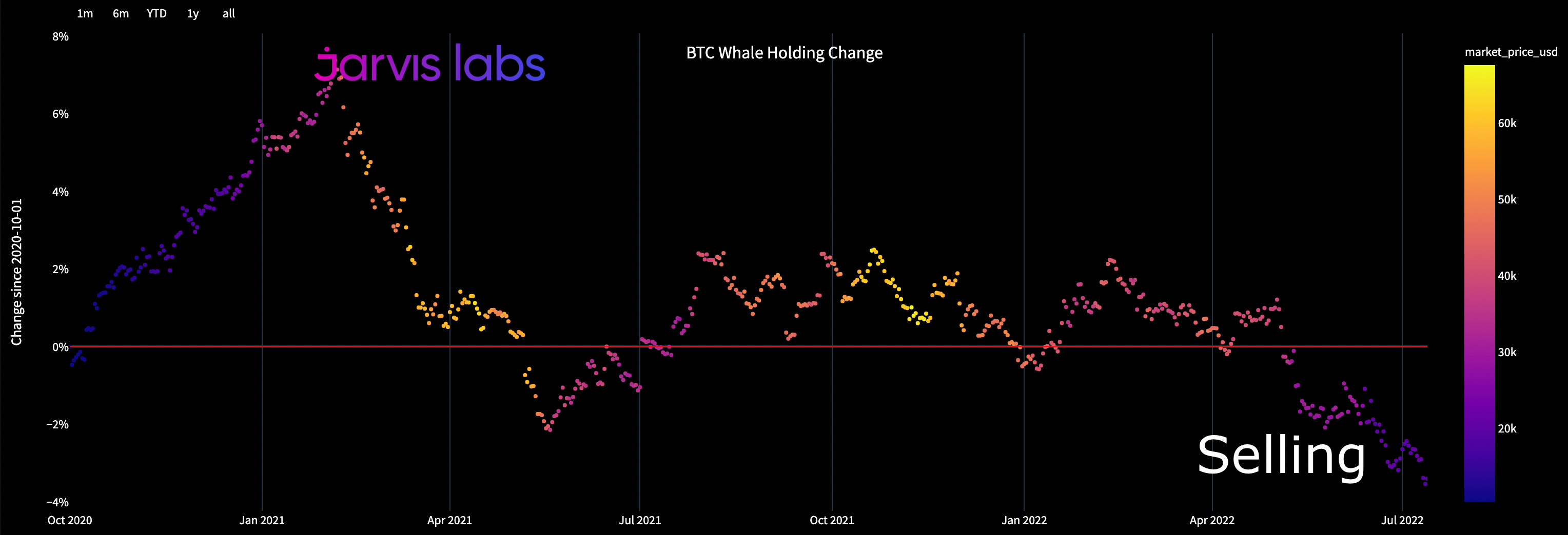 The chart below shows us the change in holdings by whales. The higher the colored dots go, the more positive accumulation taking place. The lower it goes, the more selling… The color change reflects the price. We want these dots to trend up.