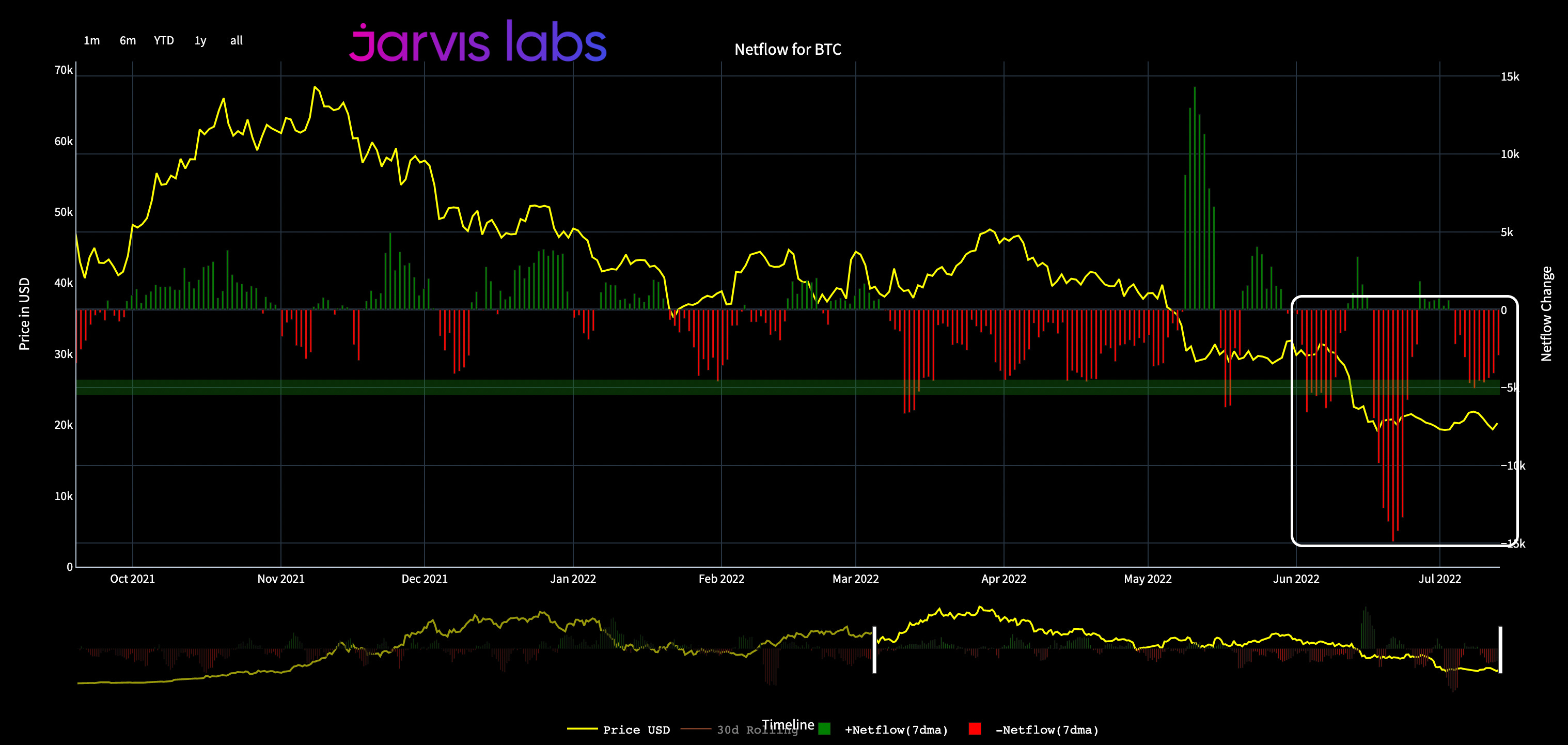 As you can see in the chart below, this measure oscillates from negative to positive. What we want to focus on are when things begin to look one sided. The red bars in the white box below show negative netflows being one sided as of late.
