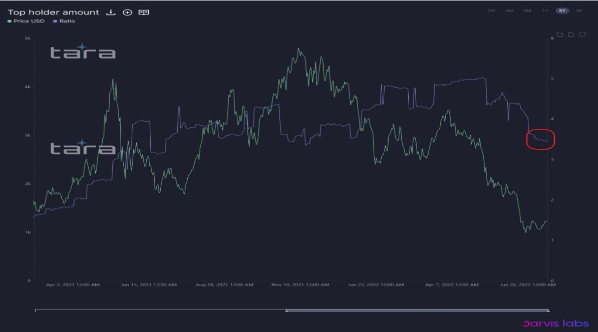 Specifically, the sell off from the Luna Terra and Three Arrow Capital (3AC) saga has once again slowed. ETH holdings by the largest wallets are staying constant as seen in the red box below.