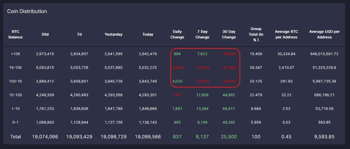 We find there is suppressed demand from big whales. The on-chain distribution chart below is showing that mega whales (wallets with 10K BTC or more) along with baby whales (wallets with 100-1k BTC) are starting to accumulate this week. But the most important whale demographic (wallets with 1k-10k BTC) are still distributing.