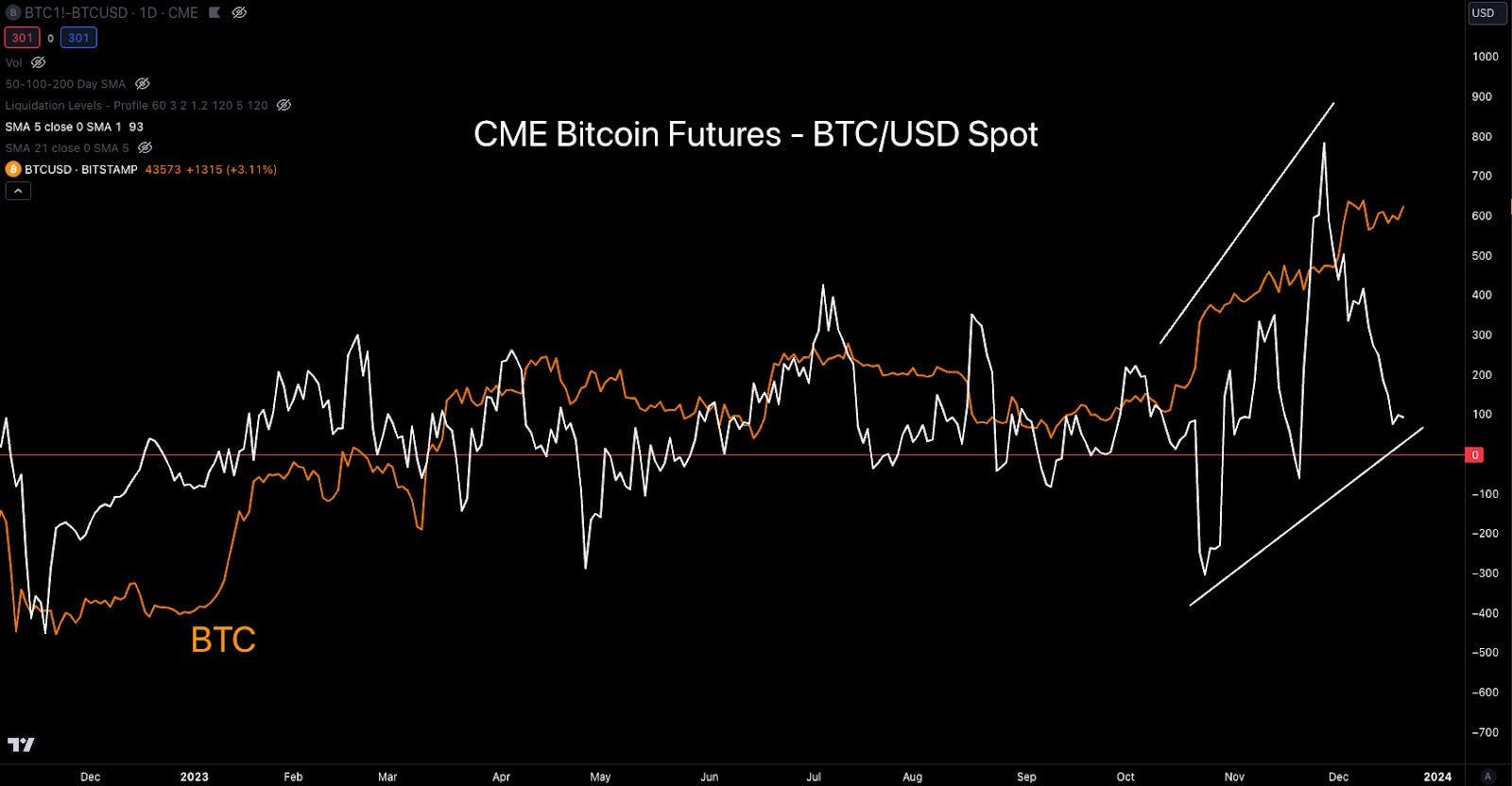When the white line is above $0, then CME – where TradFi gets Bitcoin exposure – is trading at a premium.