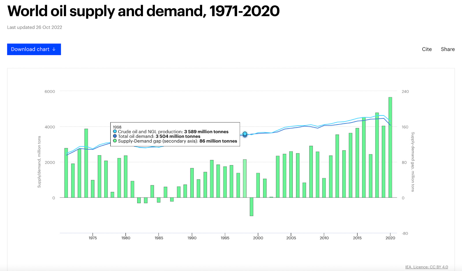 Here’s a quick example. This is world oil supply on an annual basis. Note that around the year 1999, oil supply dropped.