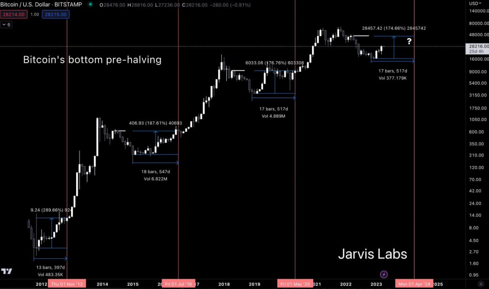 Price bottoms out between 13-18 months prior to each event. We are 12 months away from the next halving now, meaning based on this history, that’s why BTC prices have been moving higher recently..
