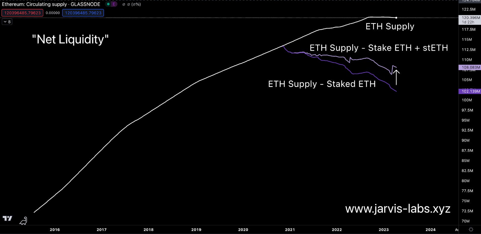 The issue with this line of thinking is that because Lido, Frax, Rocket Pool, and others offer liquid staking derivatives (LSDs), they essentially made staked ETH liquid again. Meaning this view of net liquidity is inherently flawed from the start.