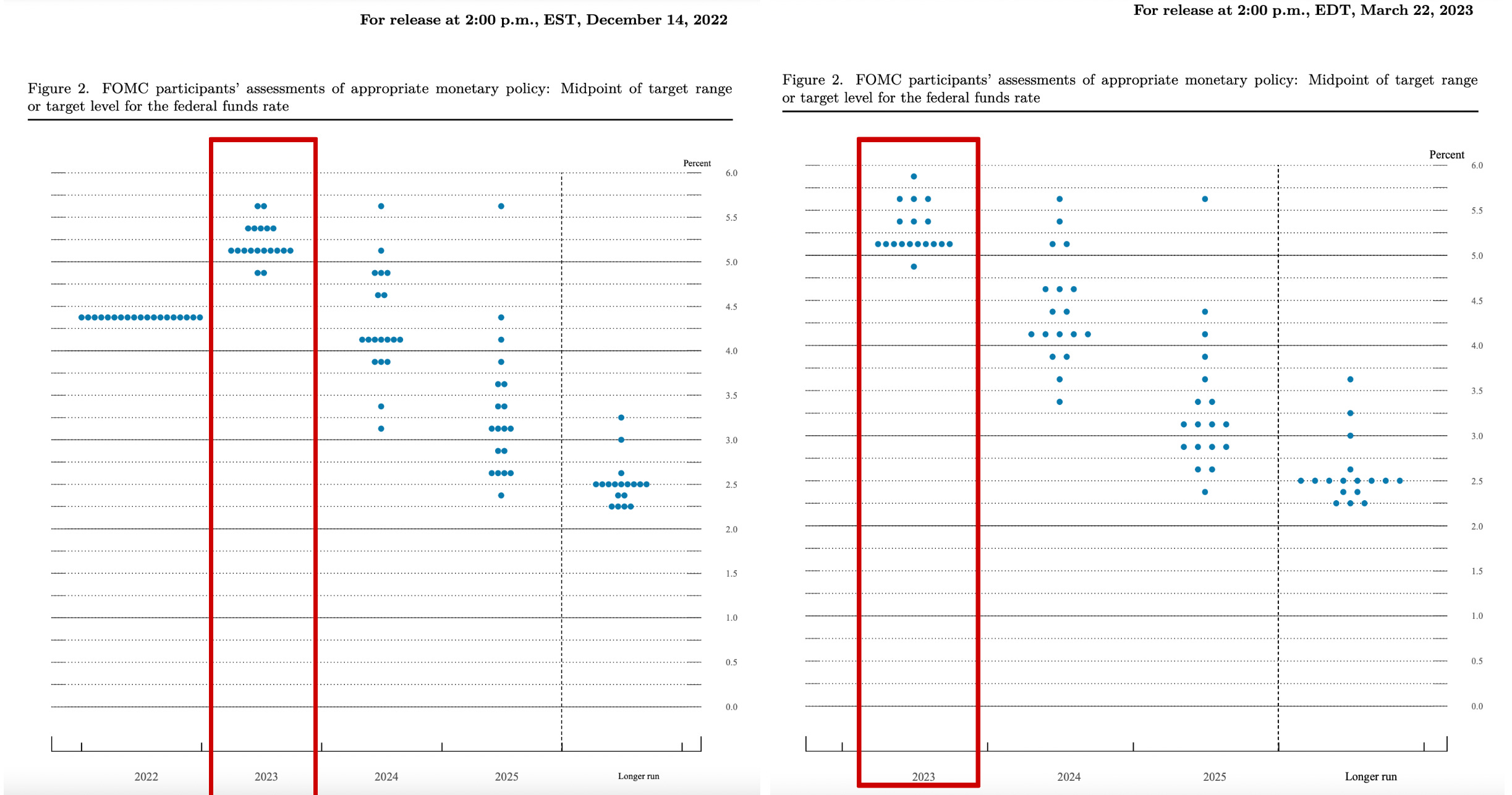 Right now, the majority of governors are still looking at setting rates between 5-5.25% in 2023. This is higher than the current 4.75-5% figure. You can see this in the chart on the right-hand side below. The chart on the left is the prior dot plot from December.