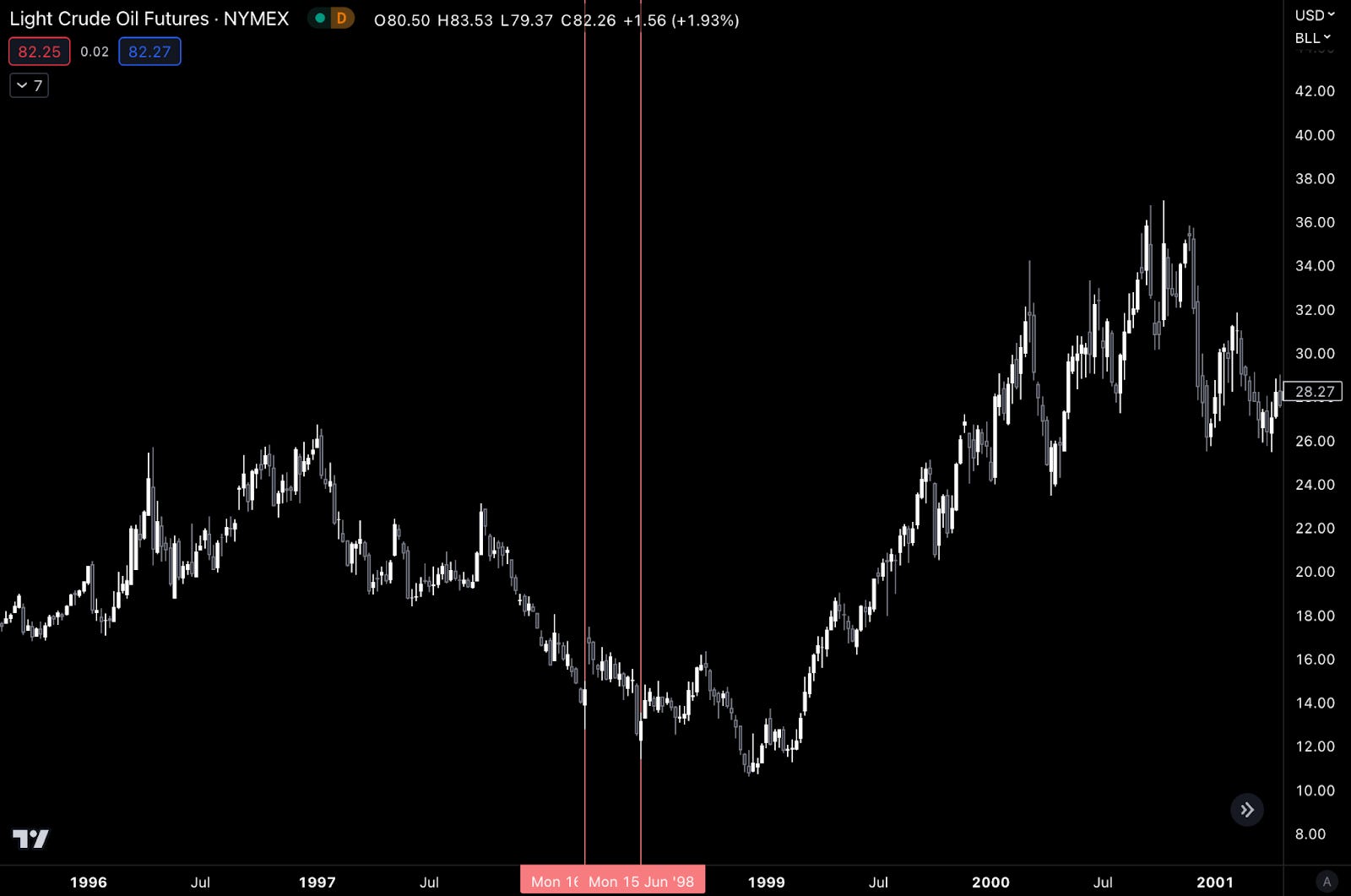 This was due to global agreements to cut production that were announced in March and June of 1998. What’s interesting is that we saw price action before these cuts went into effect.