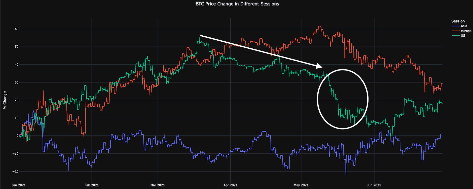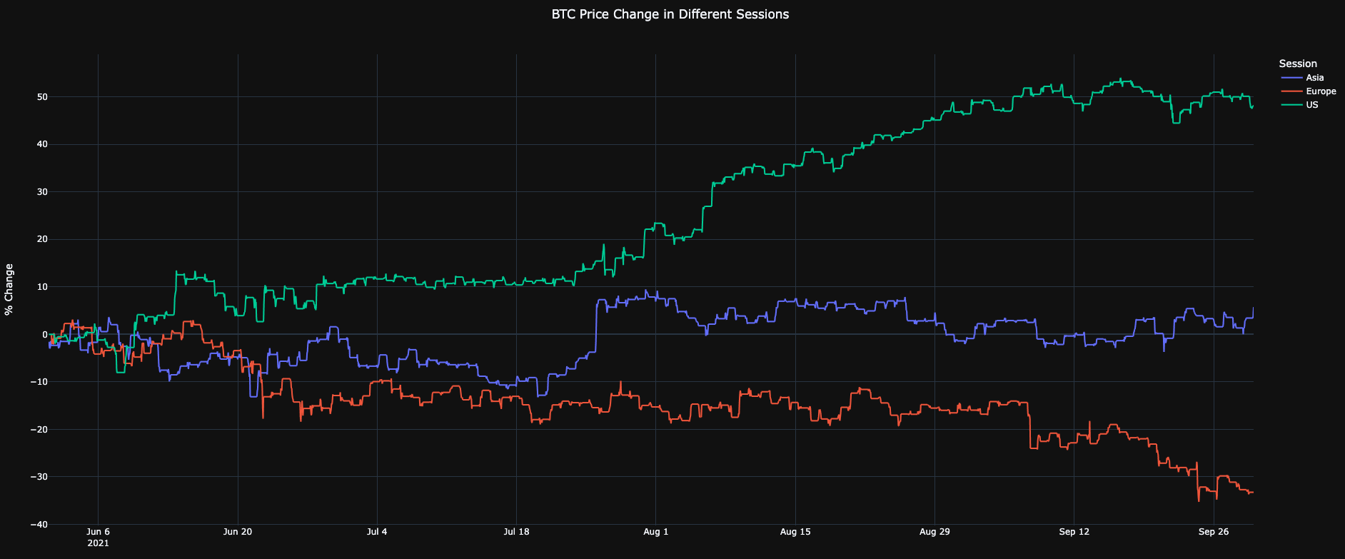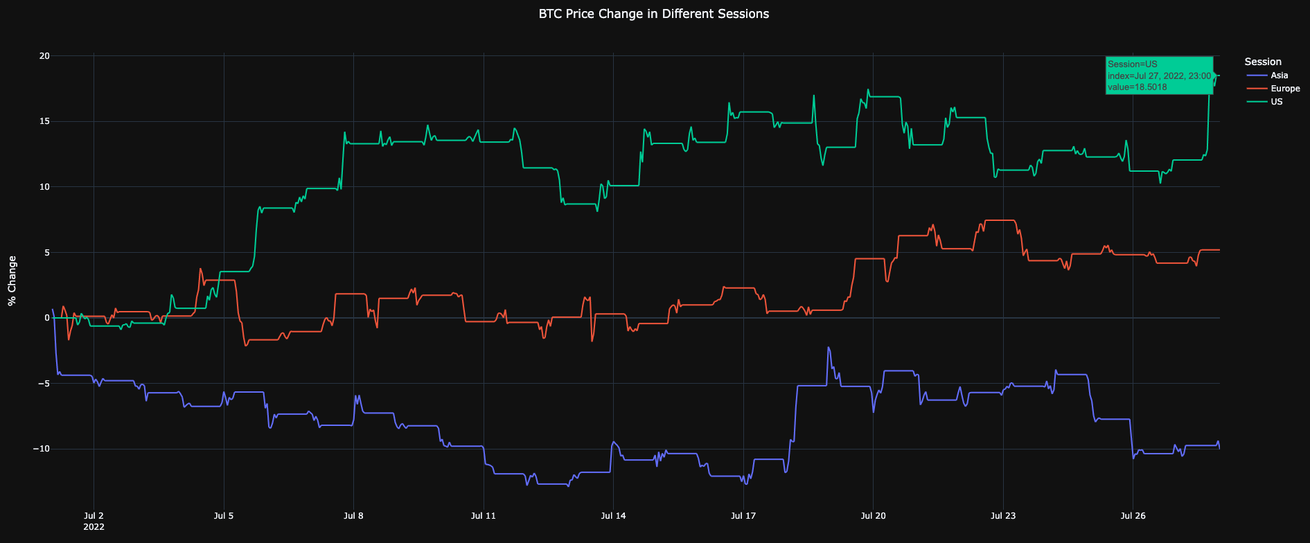 Here is BTC for the month of July. Price is up 18% during New York trading hours (green) while Asia is down ten percent (blue). Europe is in red at around 5%.