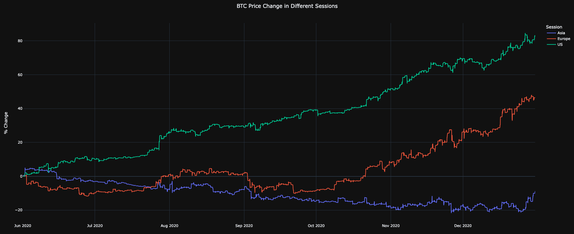 Here is the second half of 2020. BTC during NYC trading hours was up over 80%. Asia was down, again, while Europe sat in between the two.