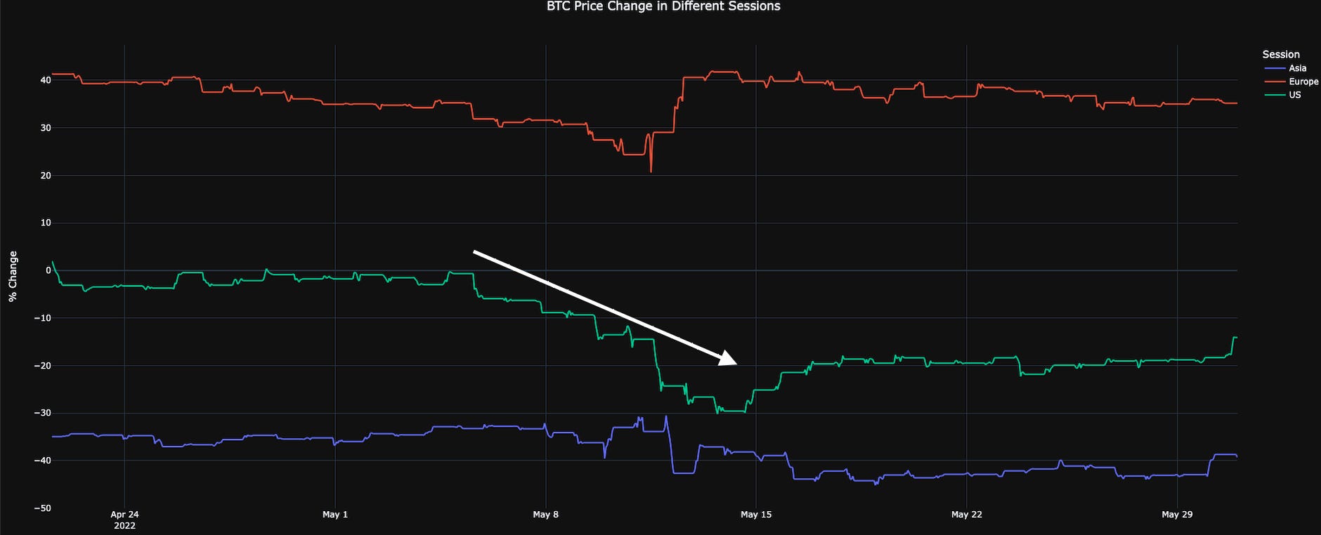 Meanwhile, NYC trading session was more responsive to larger selloffs like the one experienced around the turn of the year (2021 → 2022) where price went from $52k to about $33k in a few week.