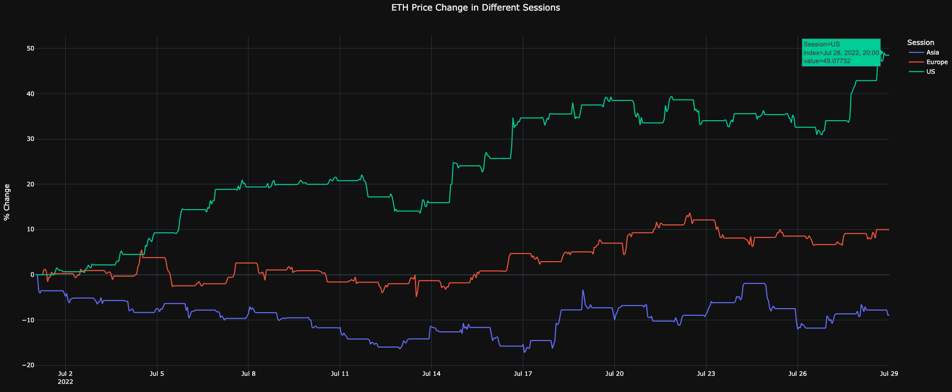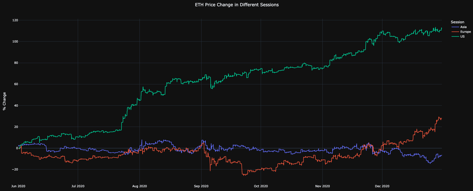ETH showed the same thing, but even more extreme. NYC timezone was up over 110% while Asia was slightly negative.