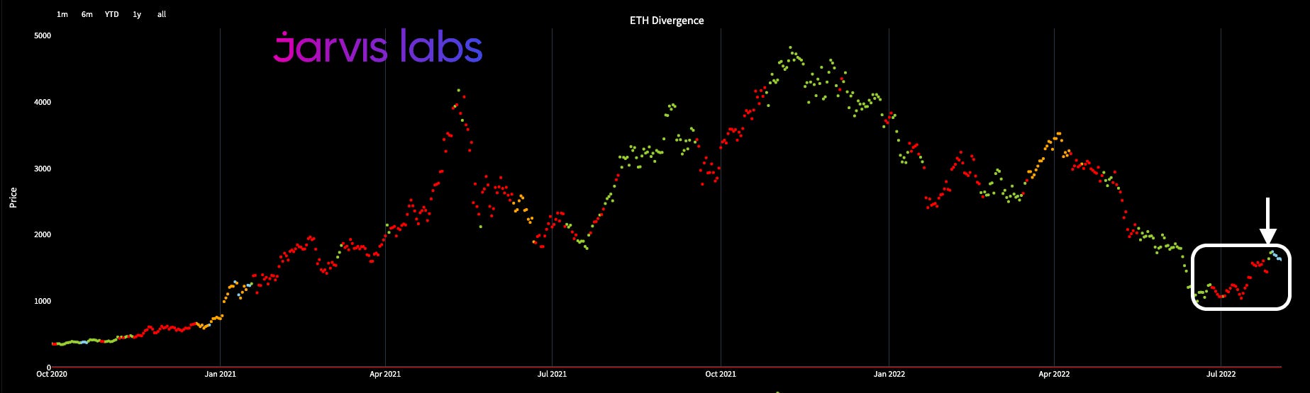 For example, here is our onchain ETH Divergence chart. The white box below shows both whales and smaller wallets accumulating via the red dots.