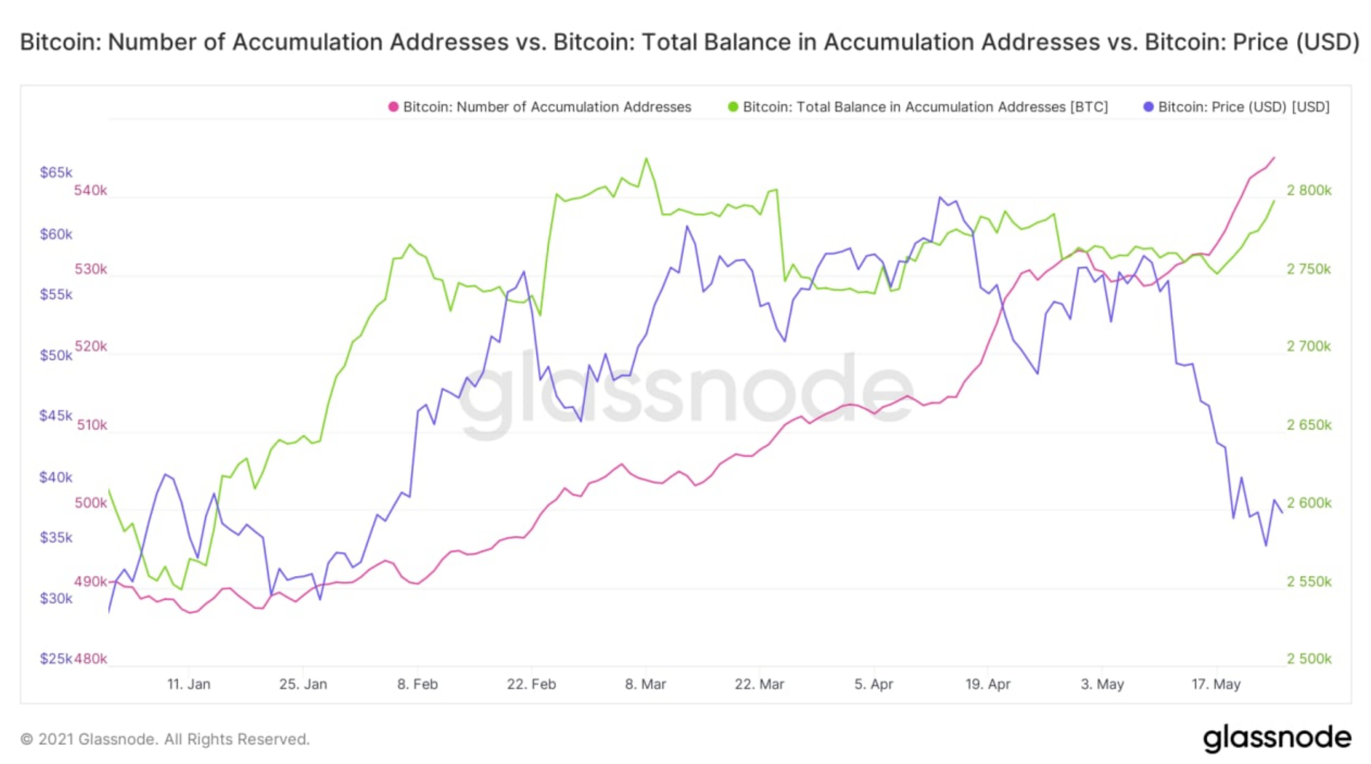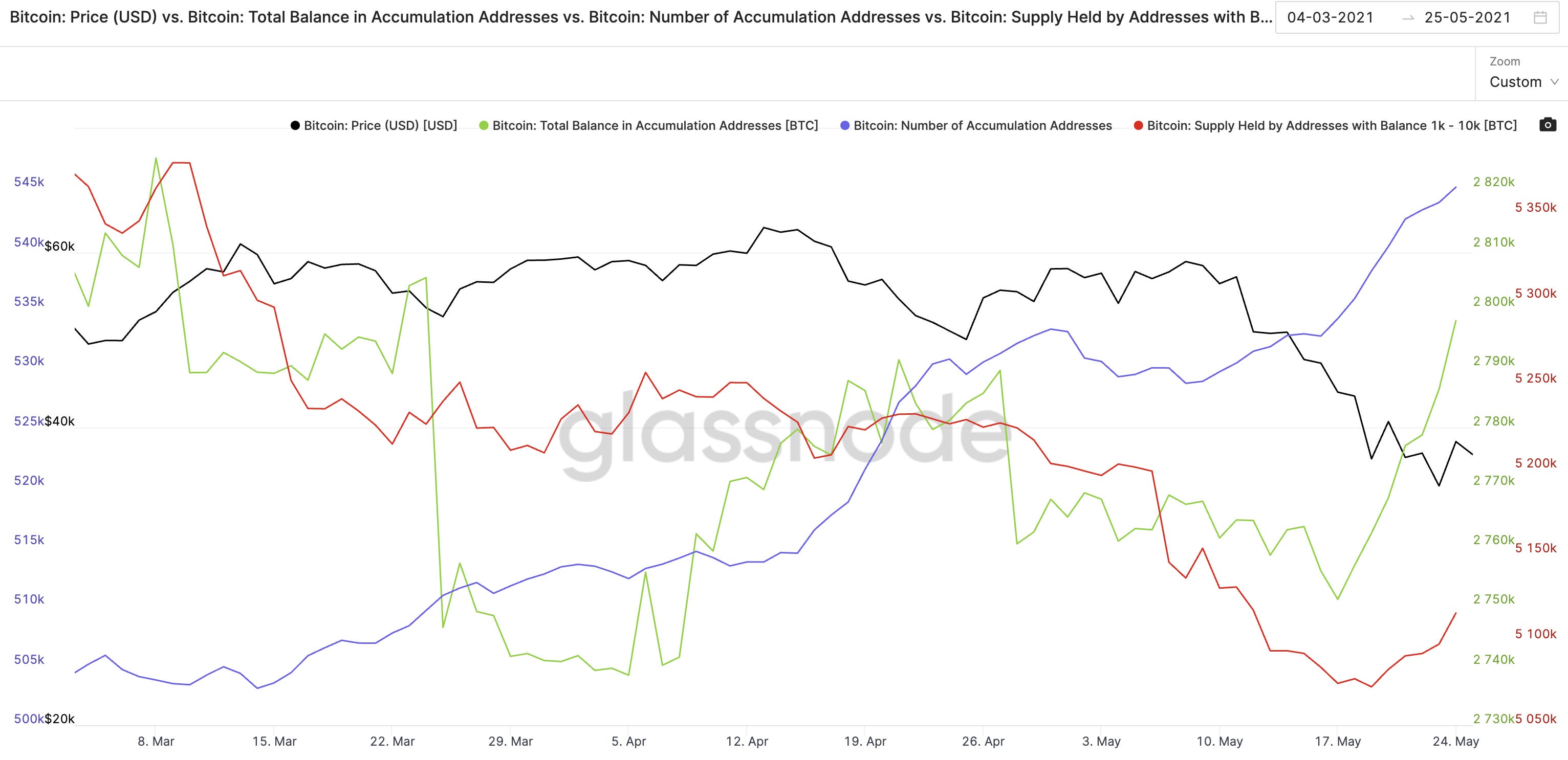 In the chart below the number of accumulating addresses (blue), total balance of accumulating addresses (green), and one whale demographic (red: 1k-10k size) is accumulating.