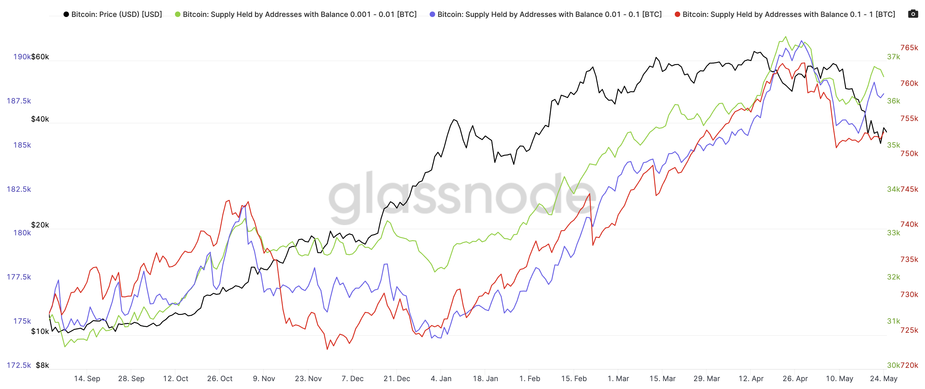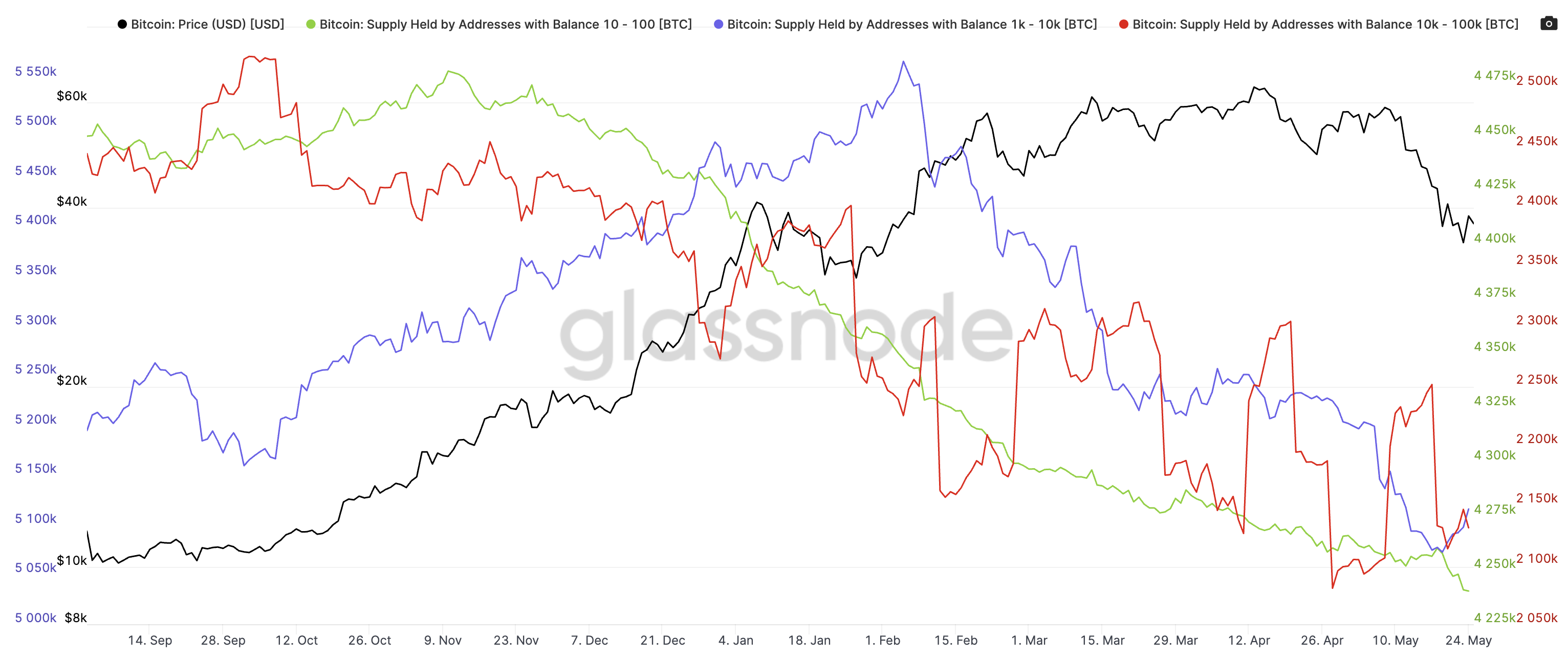 Here are some demographics of large wallets. Each show decreasing supply over the course of March, April, and May.