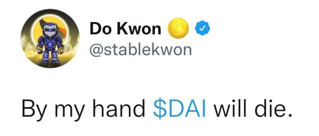 On March 23, he sent out the above tweet. He was promising that UST would eventually destroy its main competitor, another prominent stablecoin called DAI.