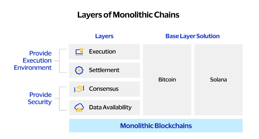 Most early blockchain projects like Bitcoin, Ethereum, and Solana took the monolithic path, with one system handling all these steps.