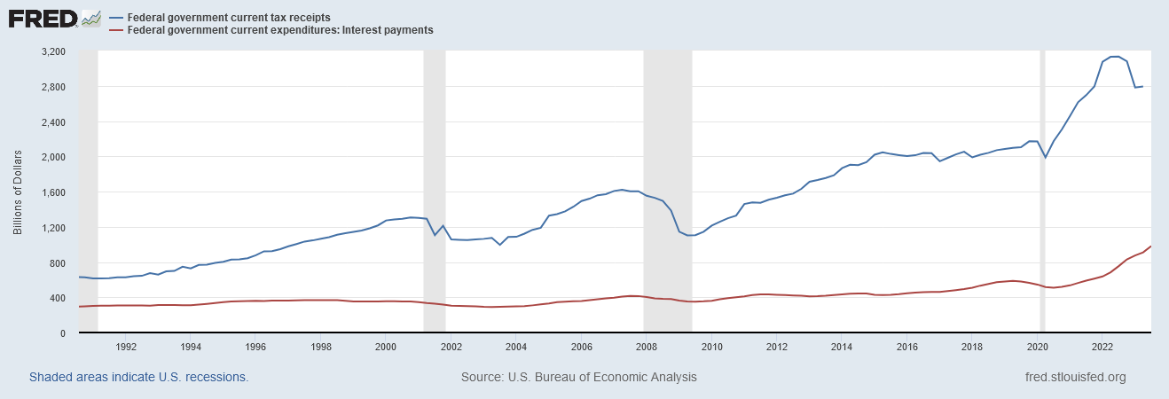The blue line in the chart below is the revenue that the government collects from taxes. The red line is the interest payments it has to make to fund the liabilities.