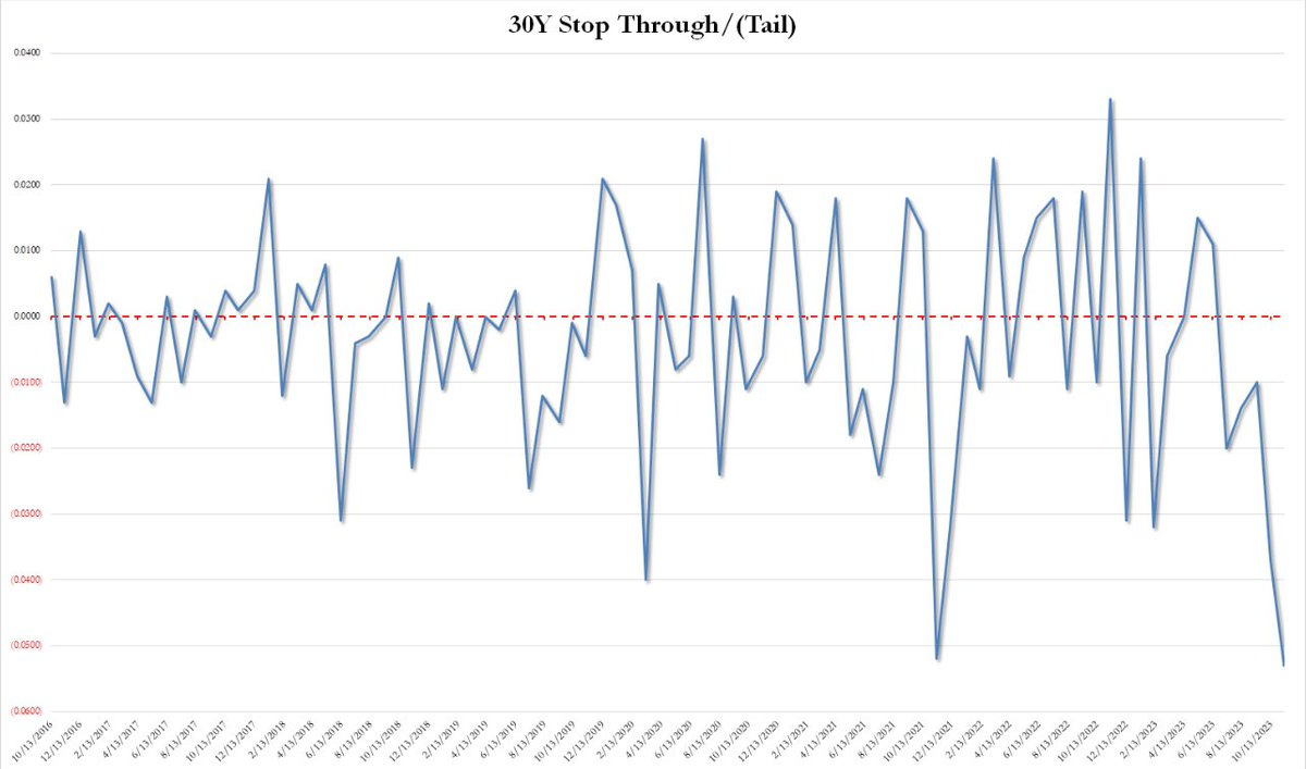 Treasury Secretary Janet Yellen was the first to jump out and publicly state that she disagrees with the downgrade. But that same day, Treasury bonds had a disastrous auction, when yields for the 30-year bonds had to jump up 5.3 basis points from pre-auction trading to entice investors to buy them. The larger that “tail” (the difference between the two yields), the weaker the auction. And this was the largest tail since 2016.
