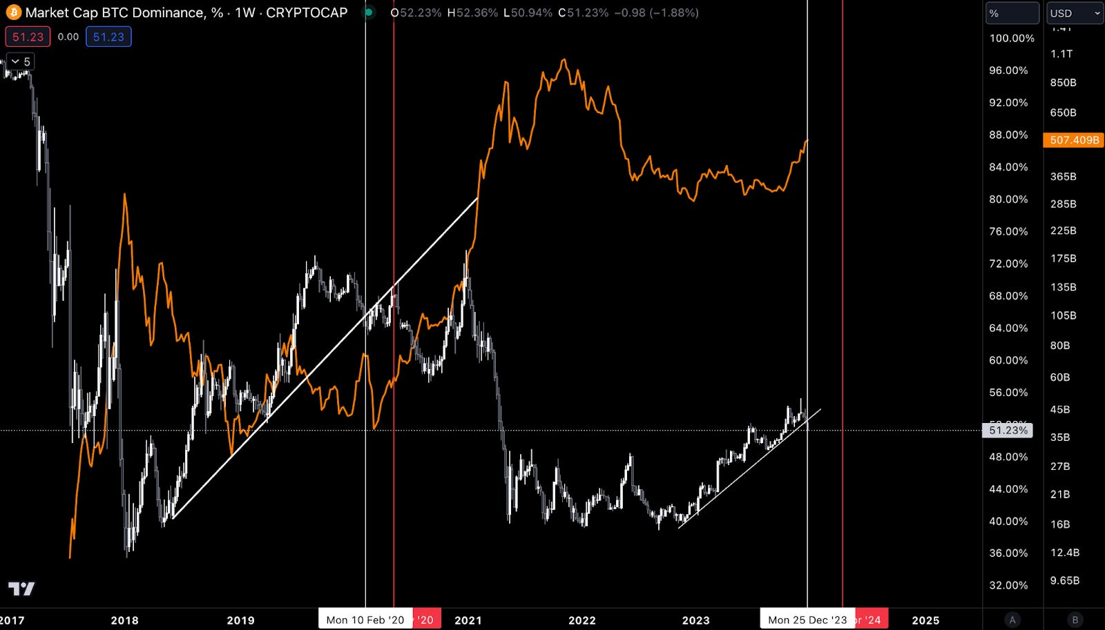 The chart shows that Bitcoin lost its trend in dominating the market. The red vertical lines are halving dates…