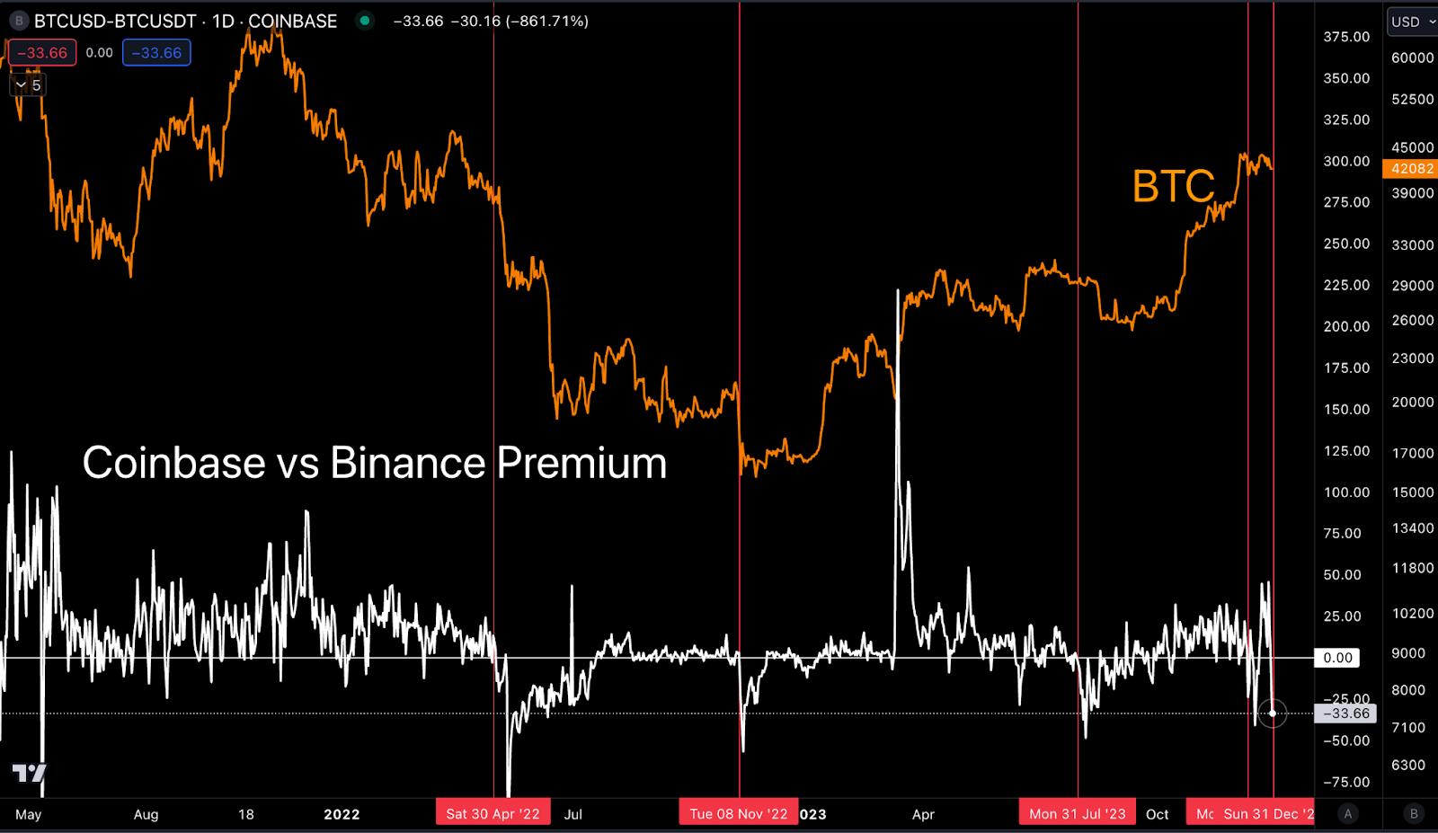 The vertical red lines below showcase times when Coinbase became cheaper than Binance’s market prices. That’s where we sit now, and this tends to hint at softness.