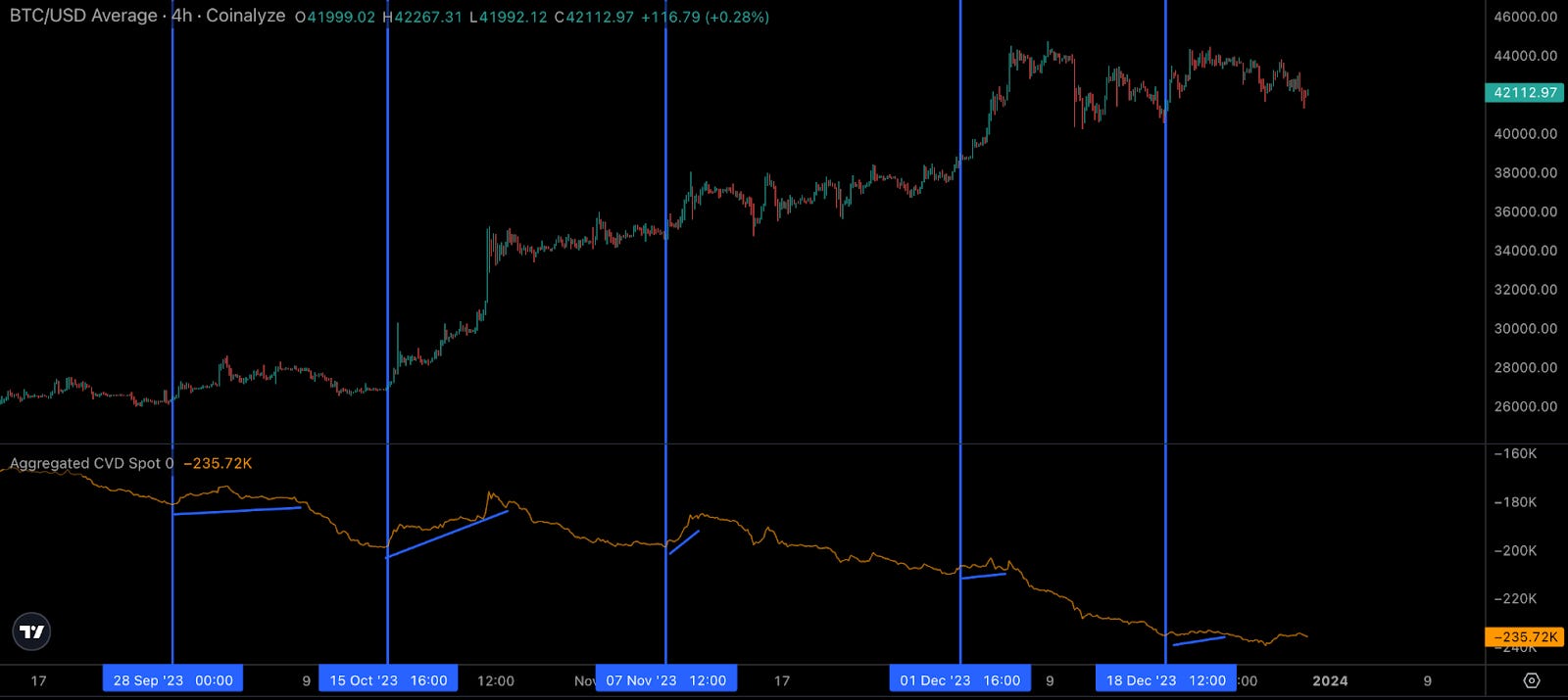 The first metric I like to pull up is cumulative volume delta of spot markets. It’s a way to see if buyers are aggressive or sellers are aggressive for spot Bitcoin.