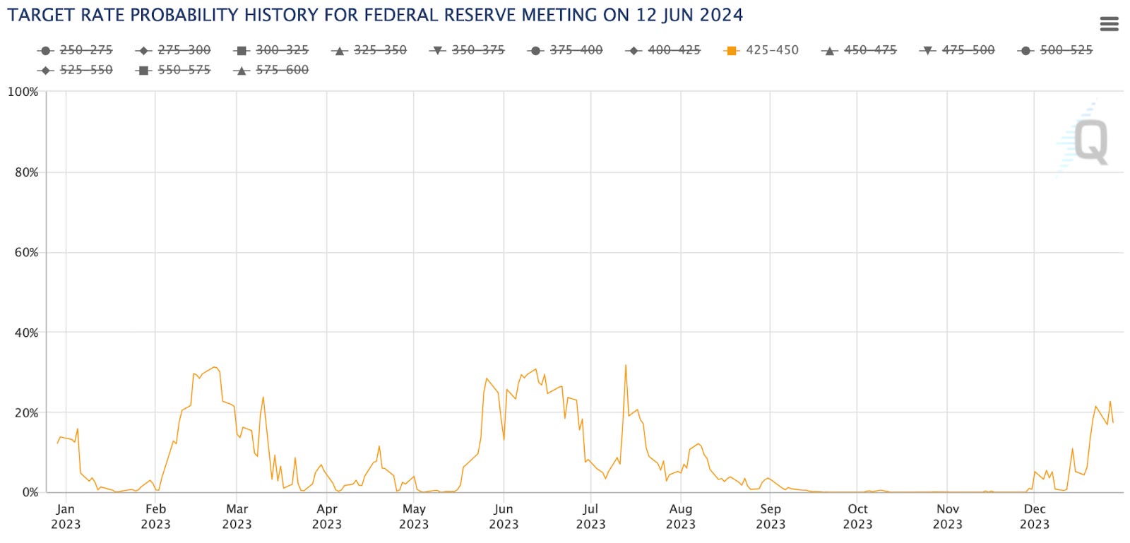 To better track this sentiment, we can watch this chart. It’s the expectation of what rates will be at the June 2024 FOMC meeting. I honed in on the 4.25%-4.5% probability line below.