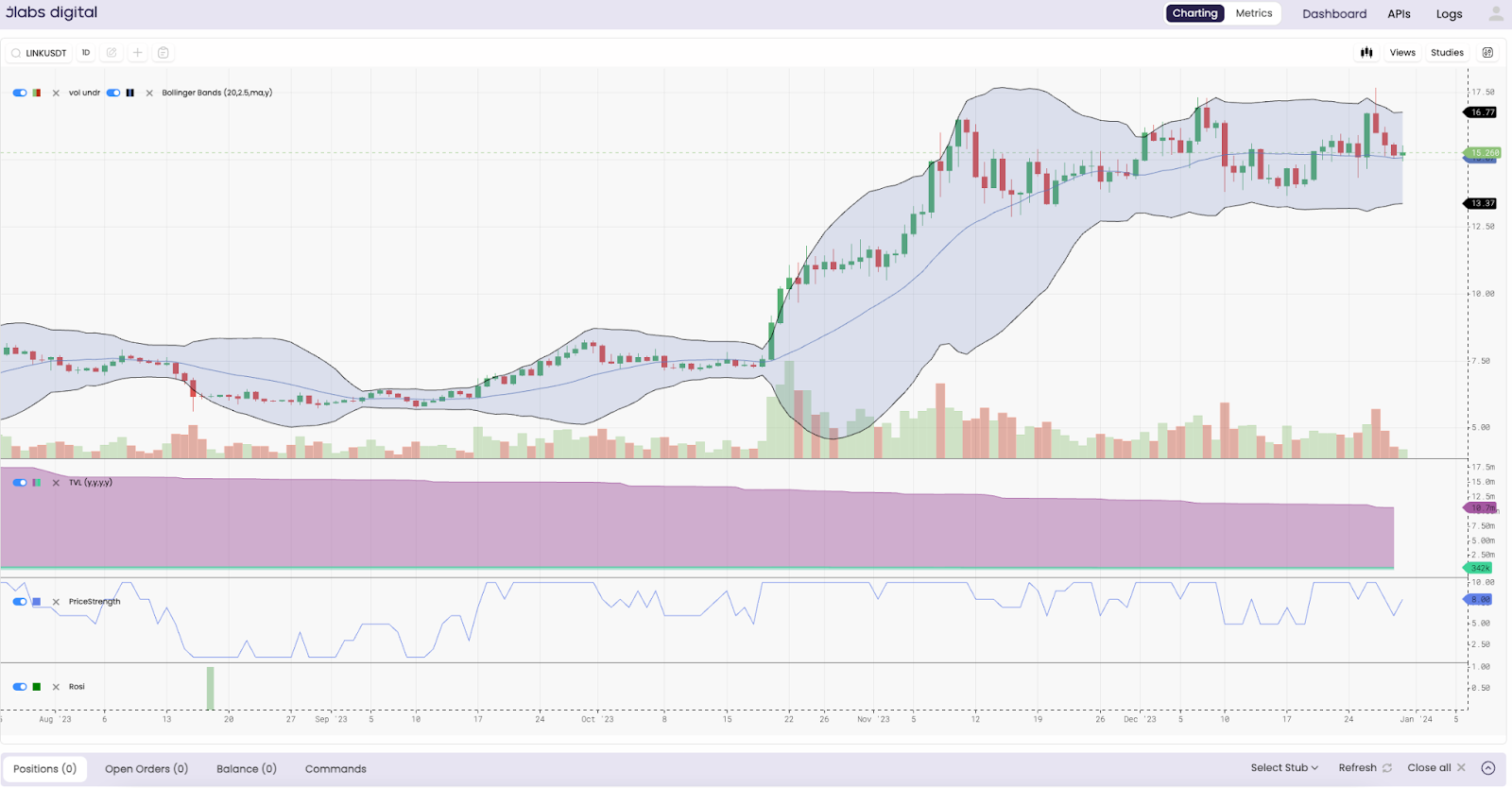 The subplots are TVL, price strength model, and ROSI… Even has some overlays there such as volume and a bollinger band. Lots of fun stuff to help your decision making. For those that also have a J-AI autonomous trading subscription, you can now monitor your positions across various exchanges on this same platform.