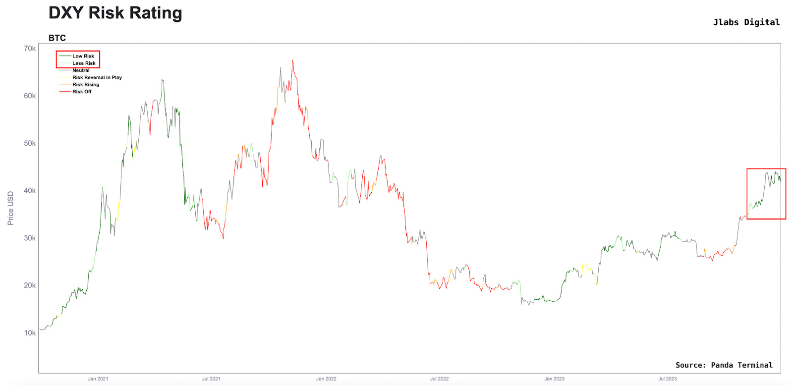 Let’s start wide with the macro and work our way down. Starting with our DXY Risk Rating metric… It’s a metric that tells us when the U.S. Dollar might create headwinds or tailwinds for crypto assets.