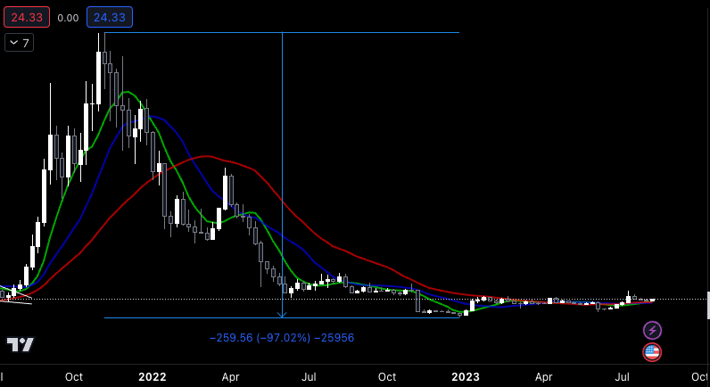 Can you guess the project? I’ll give you two hints. The first is this token has dropped 97% from its peak. The second is its price chart below.