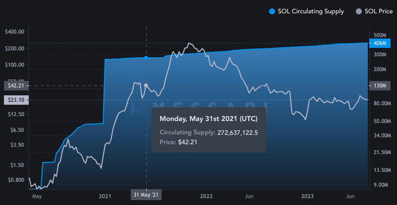 These dips all took place after a massive flood of SOL hit the market in late 2020. You can see that in the chart below, which shows SOL circulating supply just before the first major drop in TVL took place.