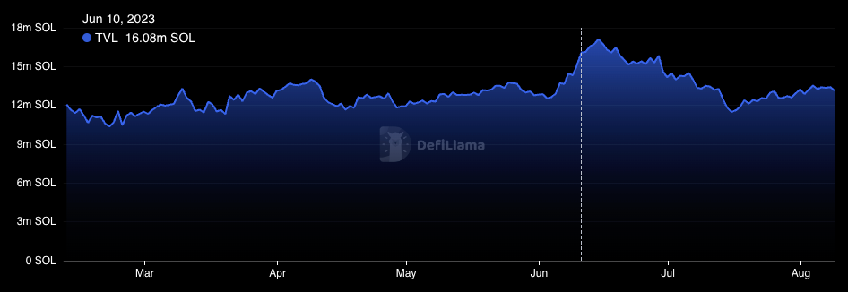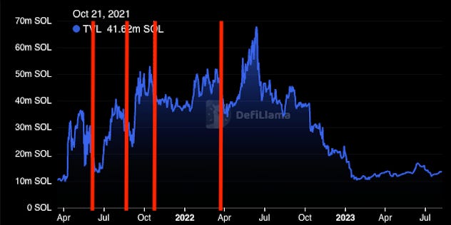 The DefiLlama chart below shows the change of TVL on Solana since early 2021, in terms of SOL.