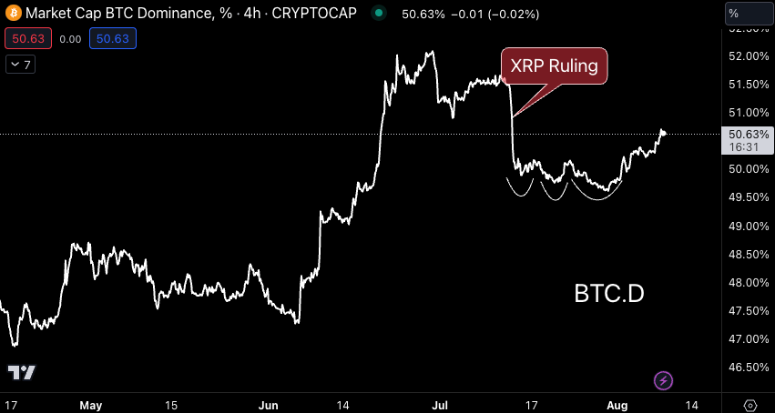 Two weeks ago, we discussed on the Alpha Bites podcast how BTC.d looks poised to fill the gap created on the heels of the first XRP ruling from Judge Analisa Torres, which opened the door for most altcoins to potentially avoid being deemed securities.