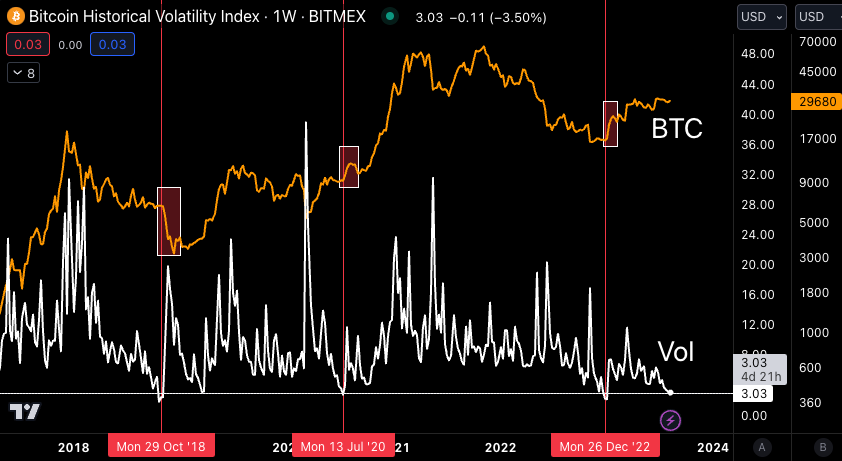 While J.J. is never somebody I would doubt, I just had to look at it with my own pupil-less eyes. As the white line in the chart below shows, volatility as measured by BitMEX’s 7-day volatility index has only been lower three times in the last six years (marked by the vertical red lines).