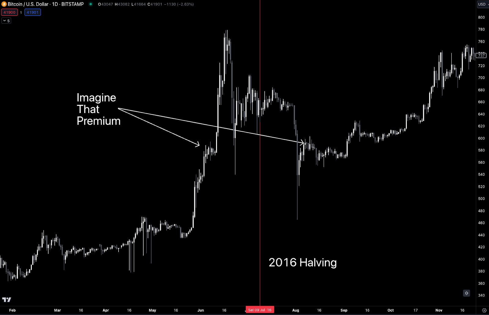 Let’s go back to 2020. The difference in Bitcoin’s price between the open of April 29 and the close of May 11 was $25… Negligible, no difference.