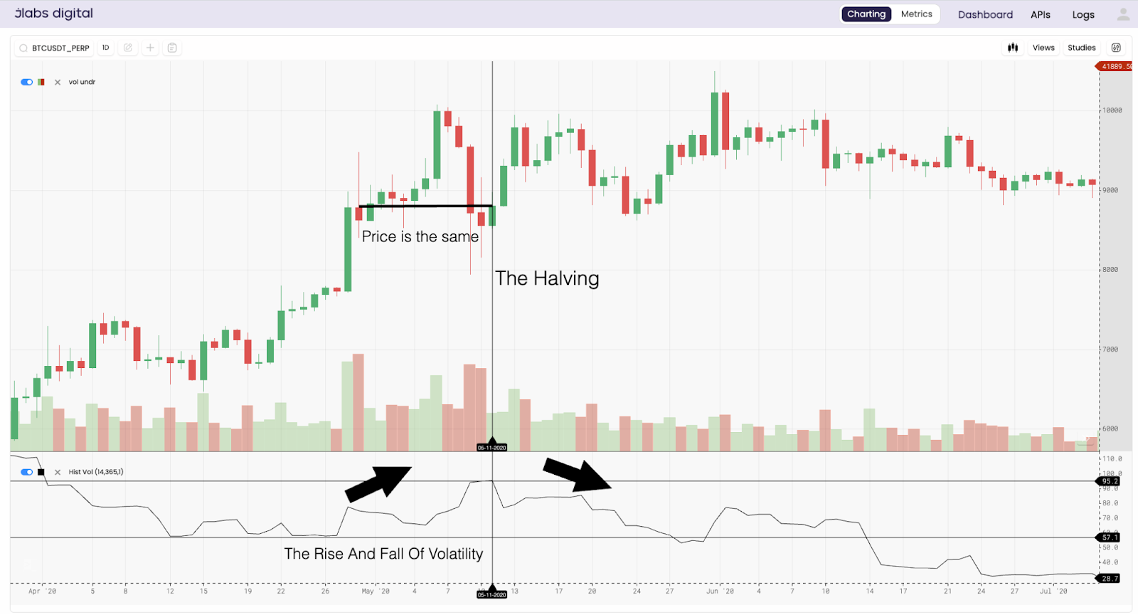 This is pretty important here… The amount of volatility that Bitcoin was experiencing was significantly higher during the halving.
