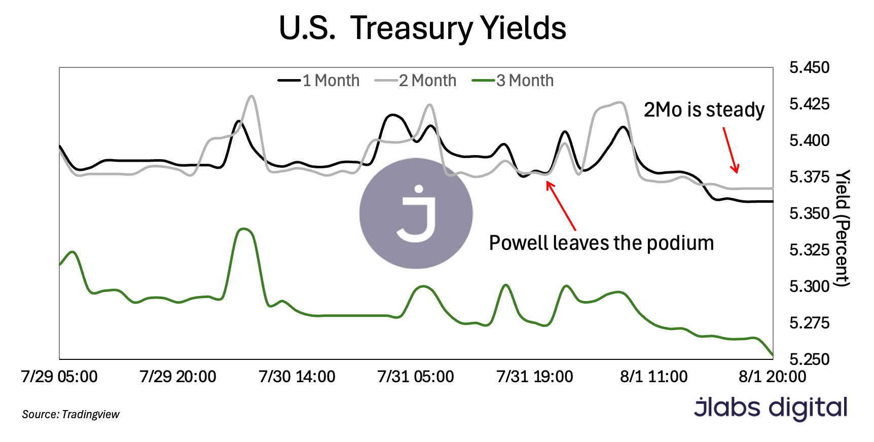 The verdict, the 2-month treasury was steady as can be. And instead, the 3-month (green line at the bottom) continued its descent lower.