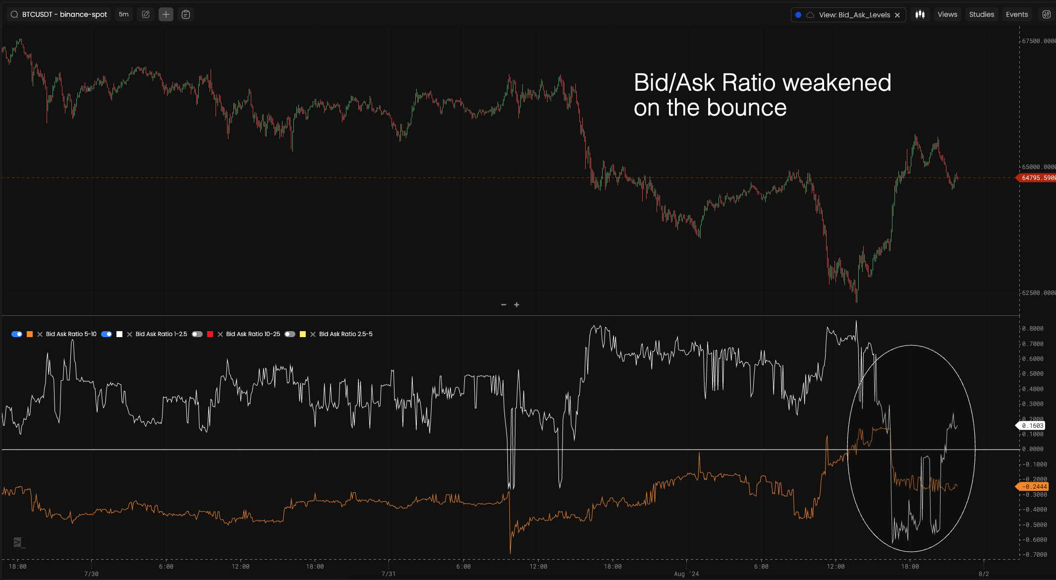 The price action gives the impression of a bounce. Not a trend reversal. And if we zoom out while showing how strong/weak the orders in the books are, we get confirmation of this bounce view.