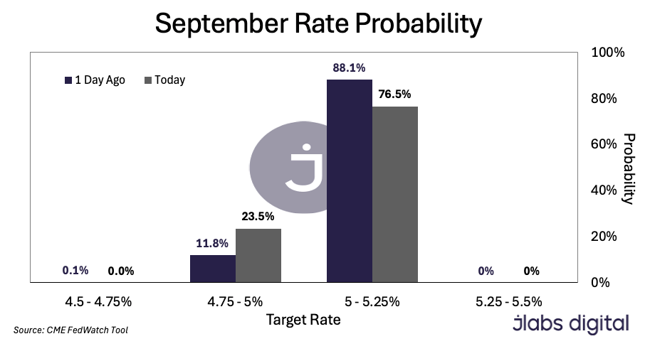 The probability for the target rate to be 50bps lower in September just went from 11.8% to 23.5% overnight.