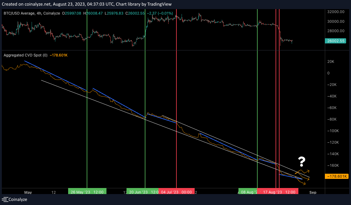 I'm waiting for one of three possibilities to unfold. I drew them below. Basically the CVD spot metric either fails to return to the white trend lines and drops lower… Or it returns… Or it breaks above it.