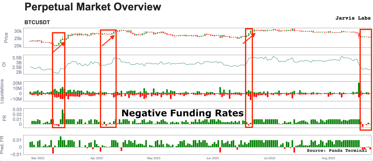 Below is a chart showcasing funding rates over the last five months. As you can see, not many occurrences of negative funding (fourth section down).