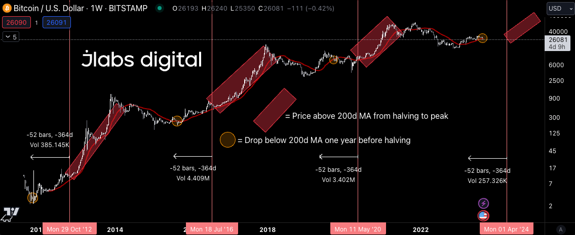 After each Bitcoin halving, price didn't close below this moving average until a major top was in. That’s significant. And something not to ignore. You can see that in the red boxes below. The vertical red lines are halvings and the moving red line is the 200d MA.