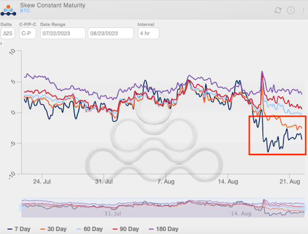 For crypto, a negative skew is definitely not the norm. And in the chart below, the red box highlights contracts that are about 7 days and 30 days from expiration expressing this negative sentiment.