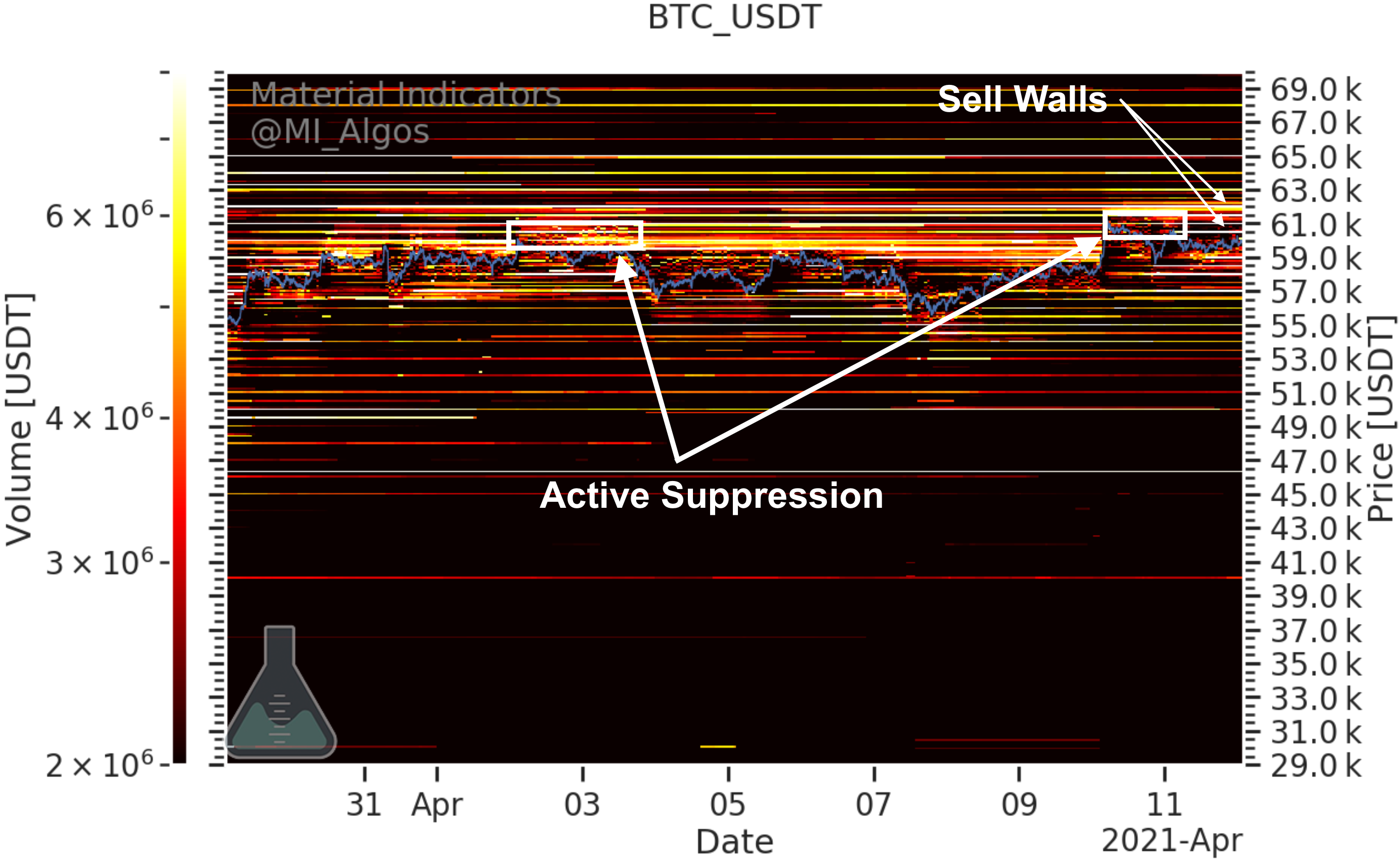 For now we have price testing the all-time high again. To see what the order books look like, let’s take a quick look at a Material Indicators chart.