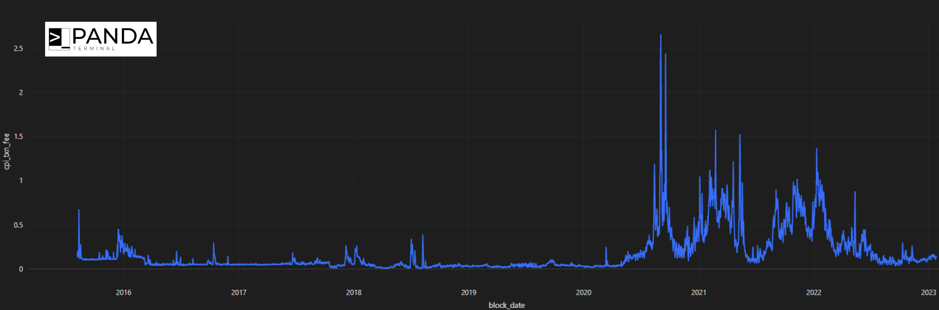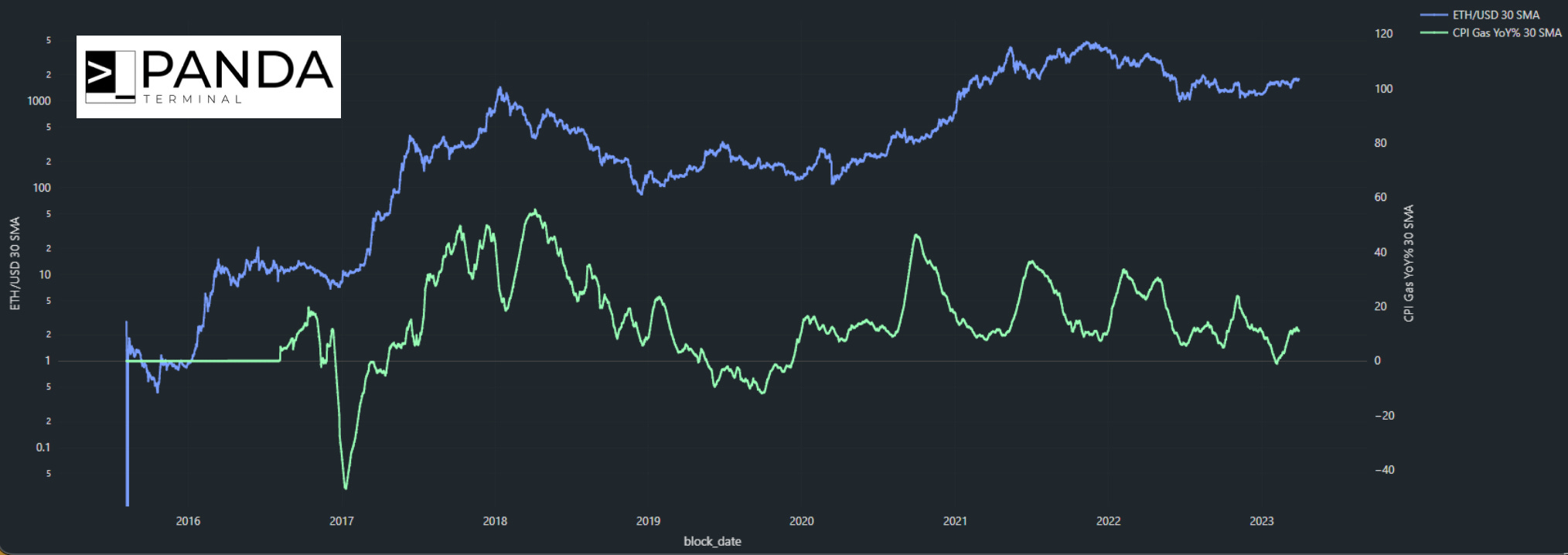 If we now bring into the mix, market price of gas… things get a bit more interesting. Once we factor in the cost of gas we can start to see CPI surge in late-2020. Anybody using the chain back then can attest to transaction fees sky rocketing. So this isn’t really anything too enlightening, yet.