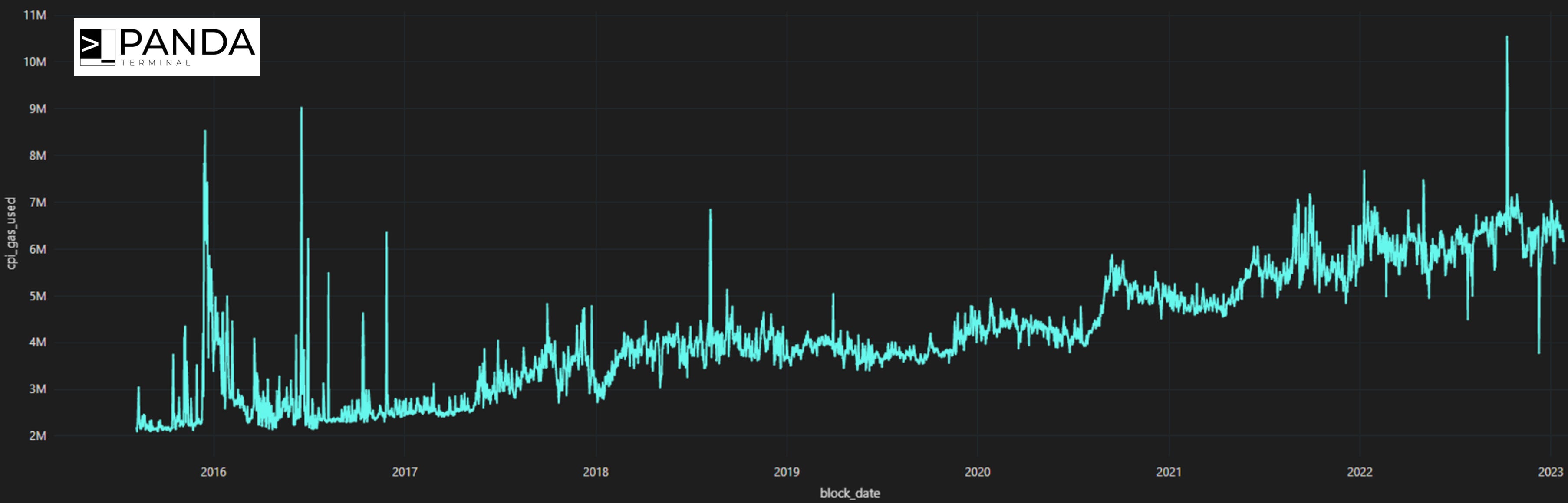 Anyways, when we combine all these things we can produce Ethereum CPI. If we ignore the market price of gas, we get a form of CPI that tells us that the basket of transactions are consuming more gas.