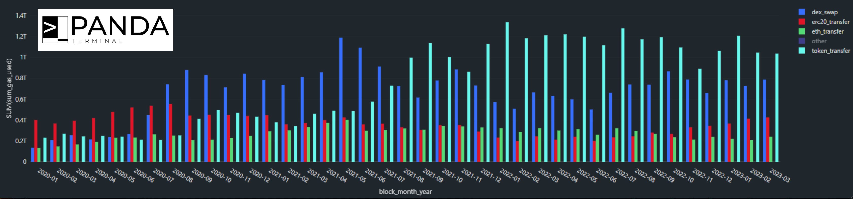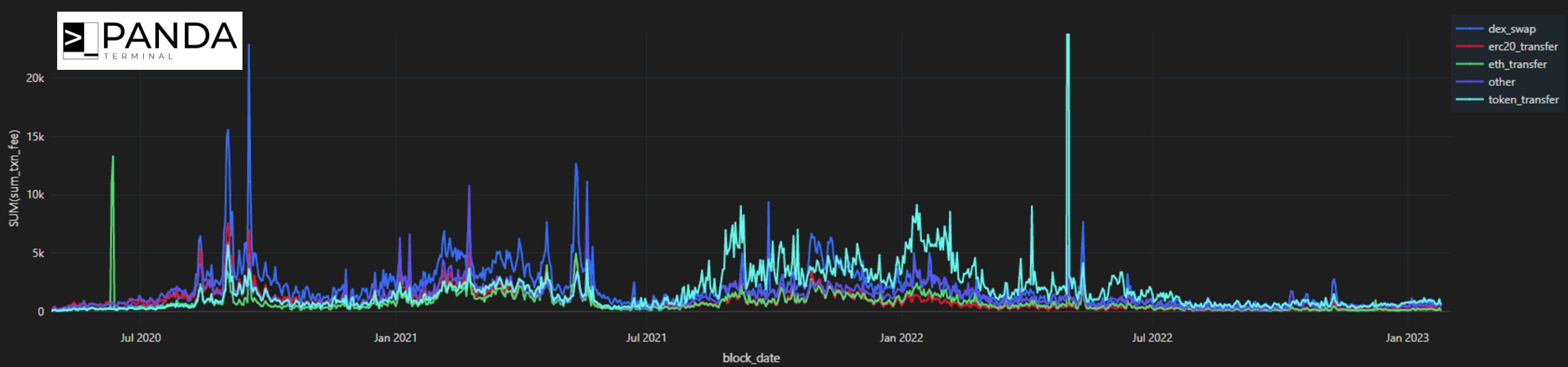 In the chart below, we have a few categories of transaction types. Note, before DeFi summer in 2020, the blue line was not very significant. The blue bar represents DEX swaps. This means the basket of good in late-2020 versus early 2020 were different. The teal line that really shows up in 2021 has a few transactions within it, one of which is NFT sales. Another change to the basket of typical transactions.