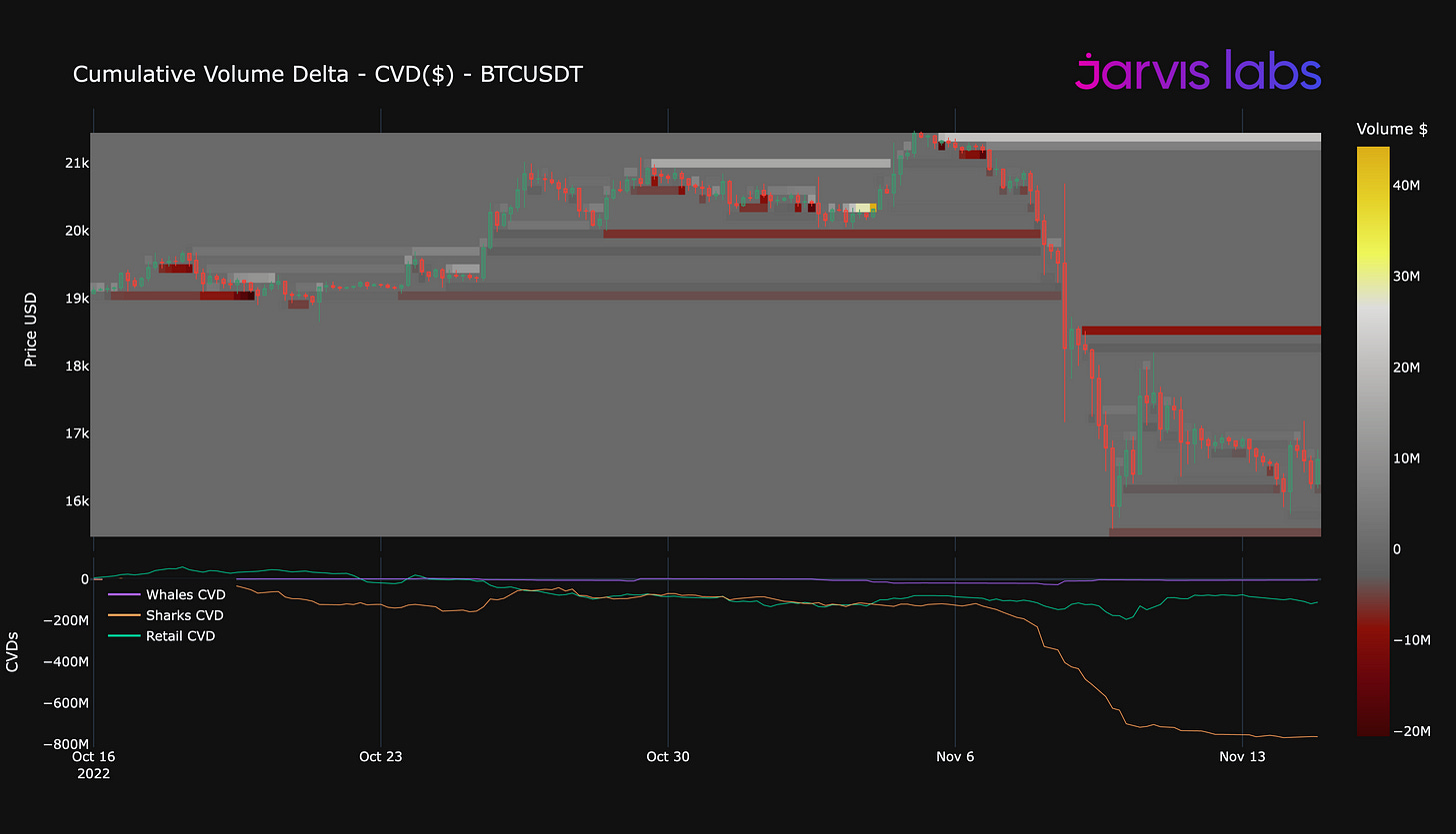 Below we see a chart showing Bitcoin’s cumulative volume delta (CVD), which gives us insight into what class of market players are buying and selling and at what levels.